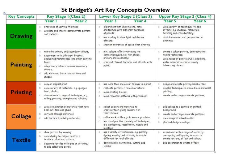 At St Bridget’s school Art is taught on a two year rolling programme covering the areas of drawing, painting, sculpture, collage, printing and textiles. These are either taught discretely or linked to various cross curricular topics throughout school. Each year group studies the works of at least one artist linked to a particular area of study.