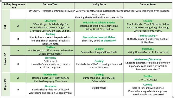 The scheme of work for Design and Technology provides a two year rolling programme of opportunities for children to engage in: