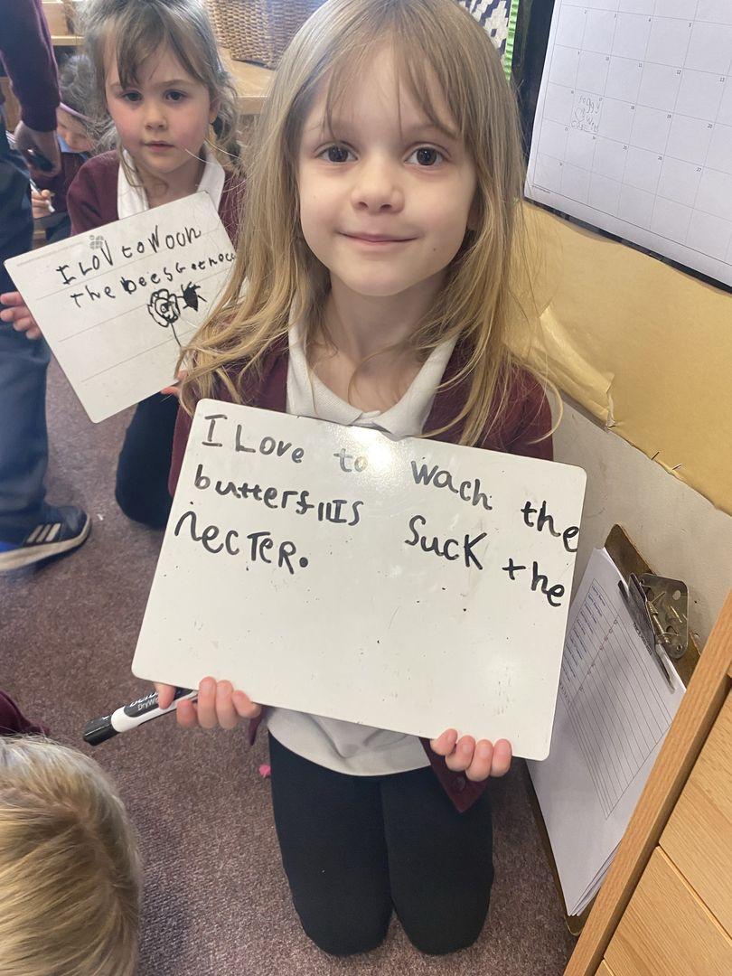 Within each teaching sequences shared writing is a key part. In our Reception class support is given to the children through a share the pen approach – this involves the children having a go at writing the sounds they can hear before passing the pen to the teacher who may write the rest of the word or part of it before passing it back to the child who may be able to hear and write the final sound. This step is often further broken down into hearing the sound but not able to record it therefore the teacher will do this for the child.