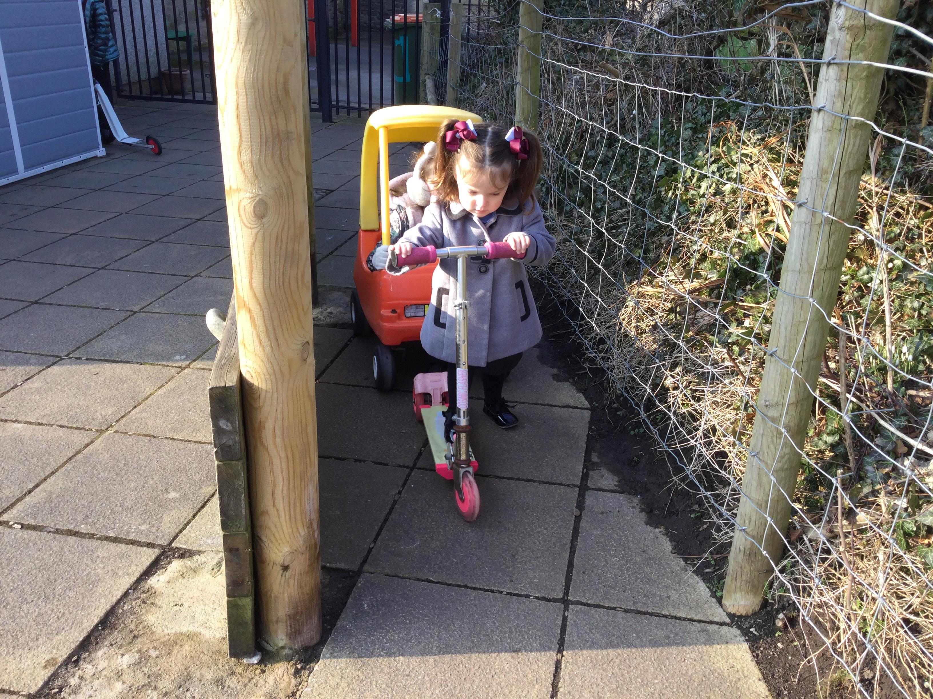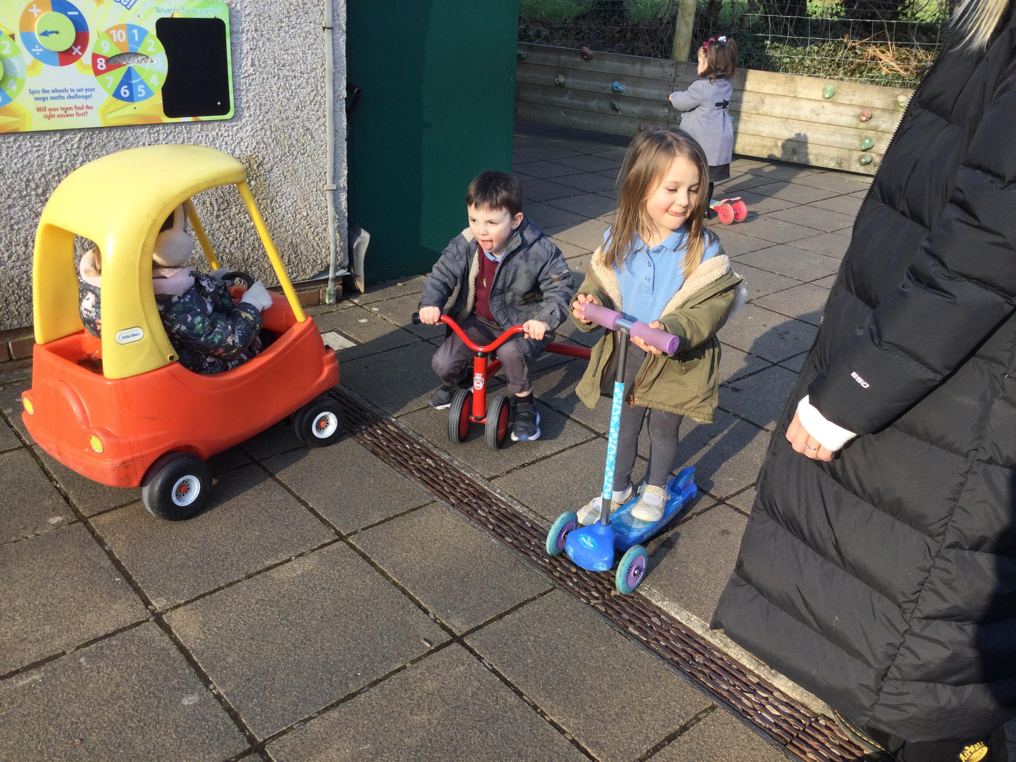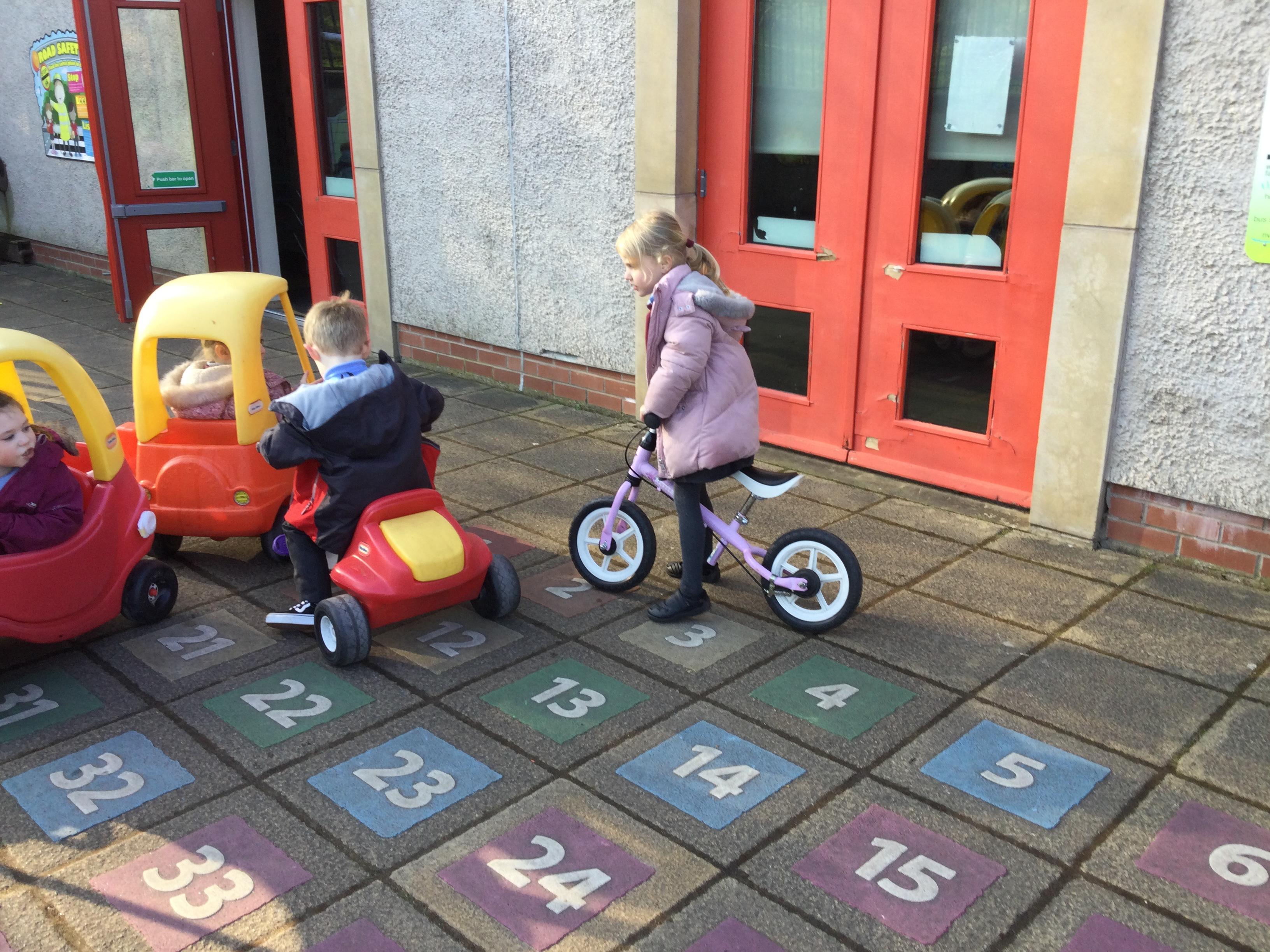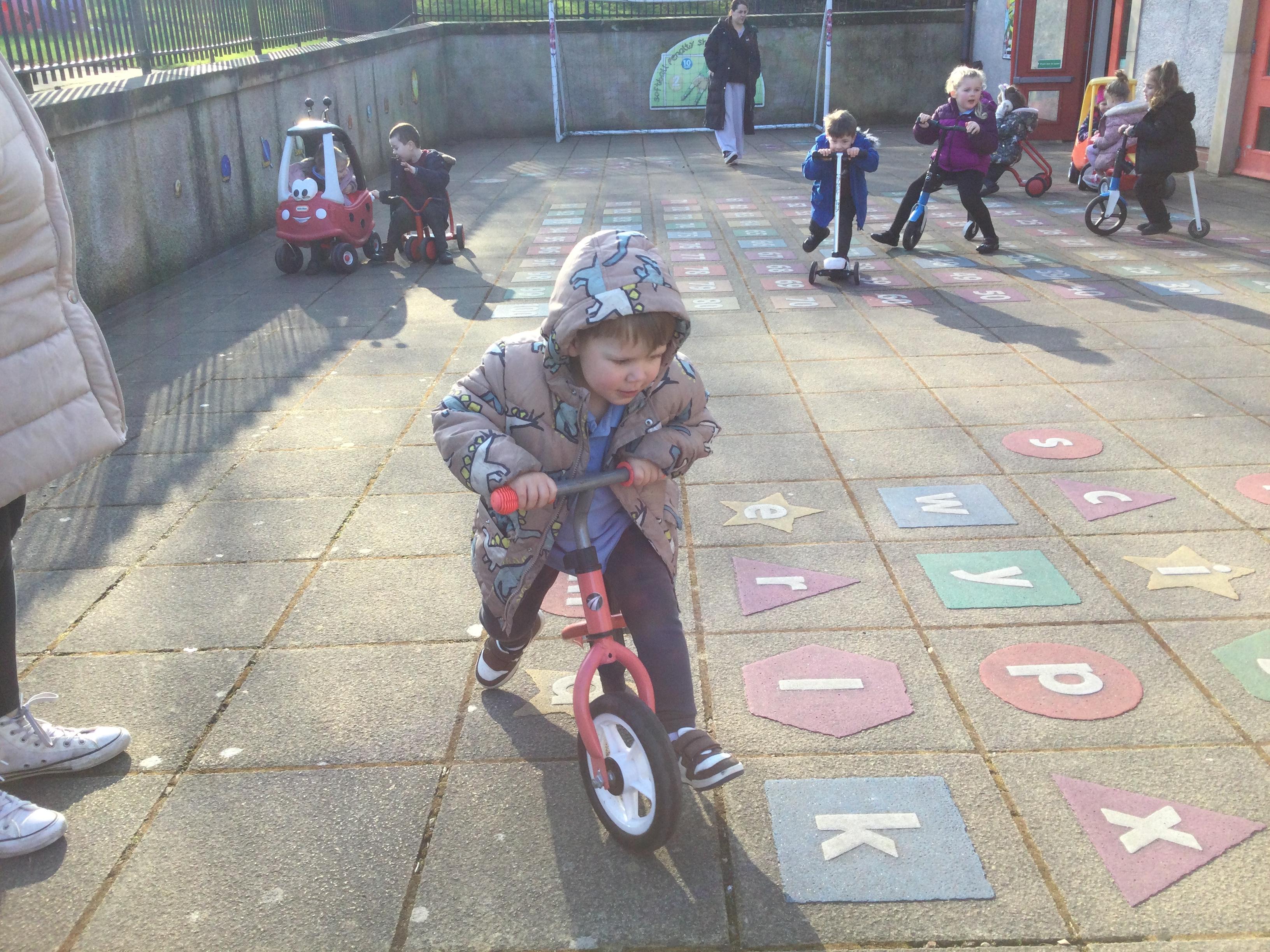 Enjoying bikes and scooters with our nursery playmates. The children are developing their gross motor skills as they pedal and scoot and in doing so show awareness of both their space and that of their peers.