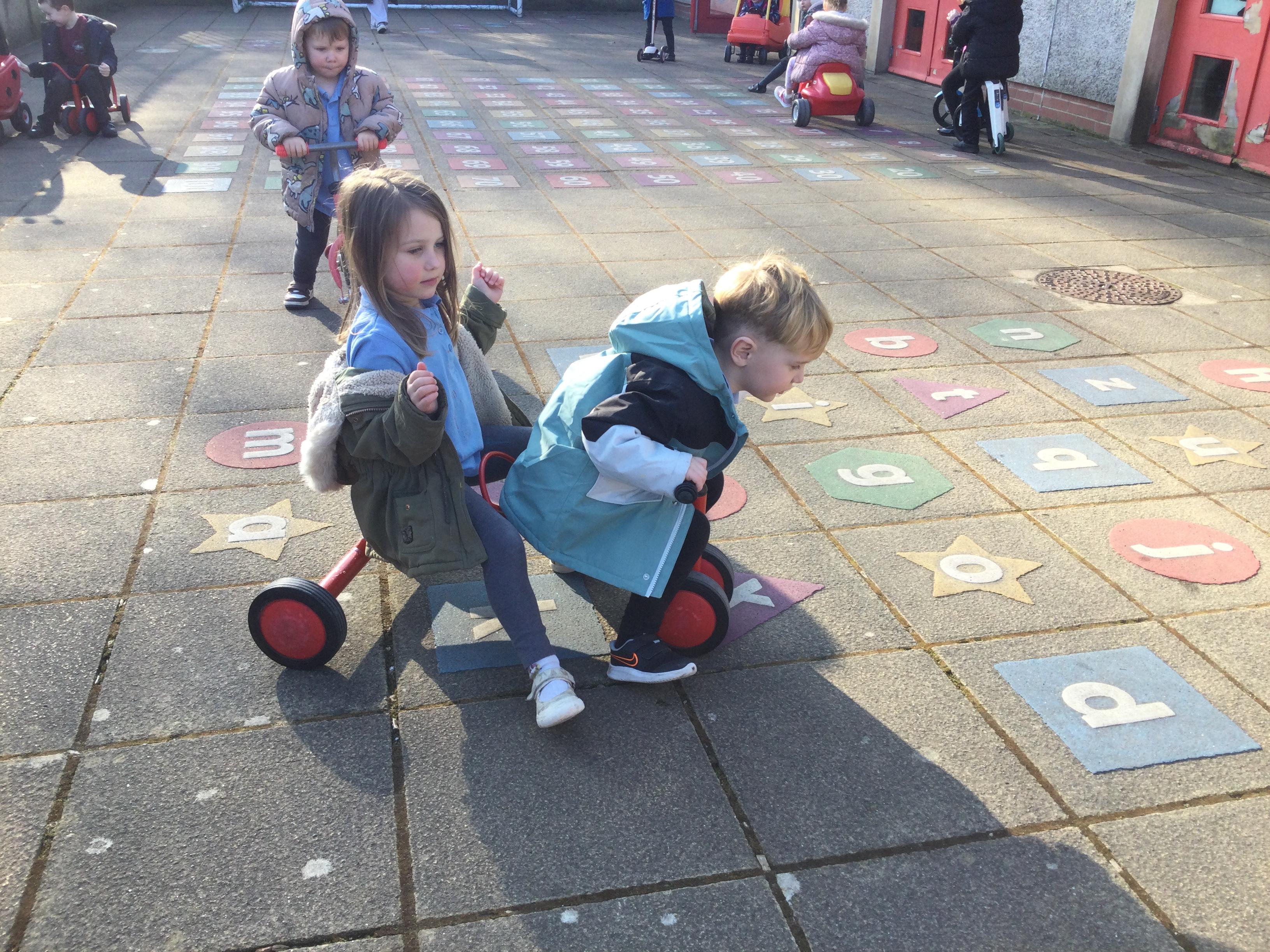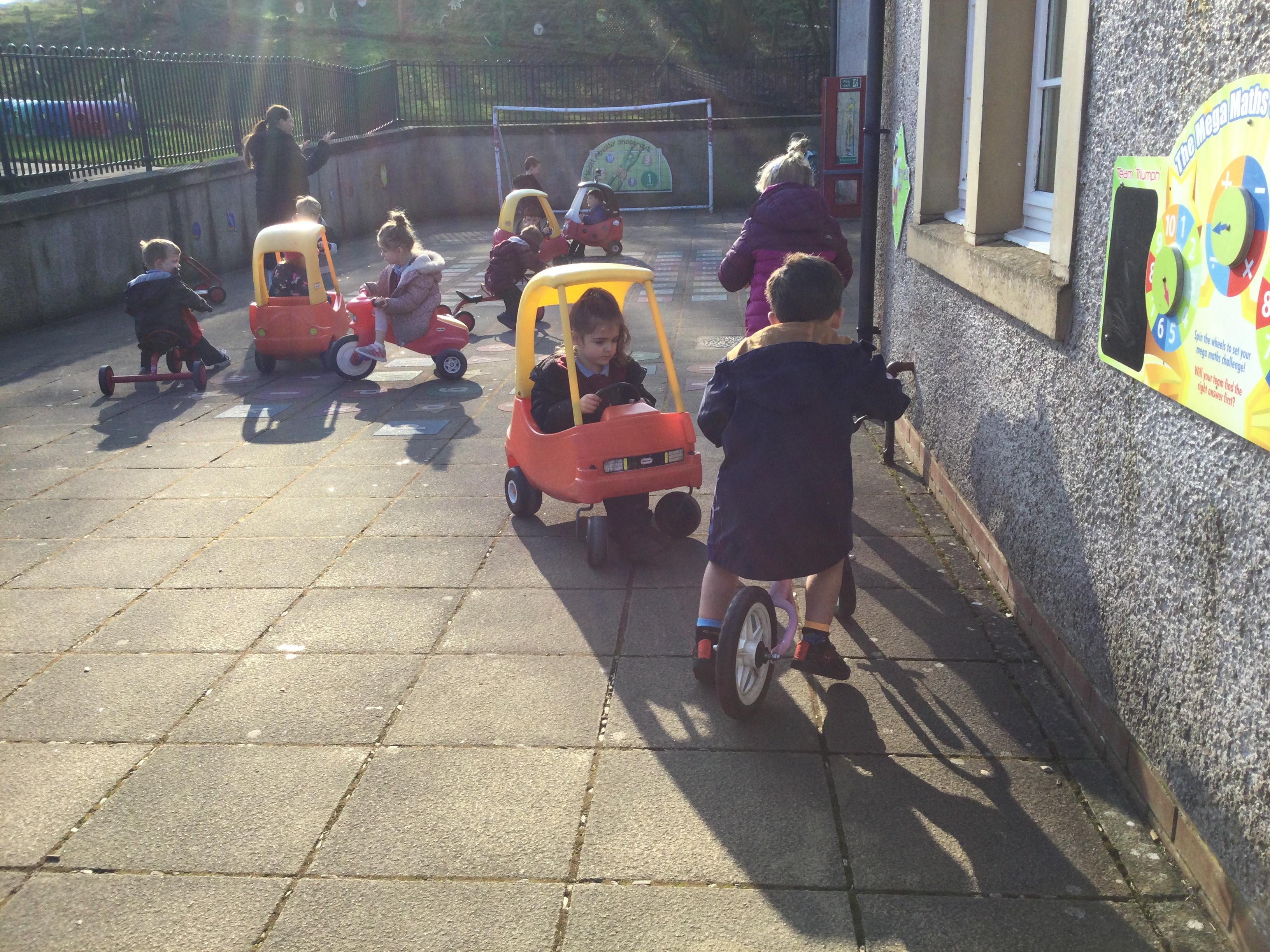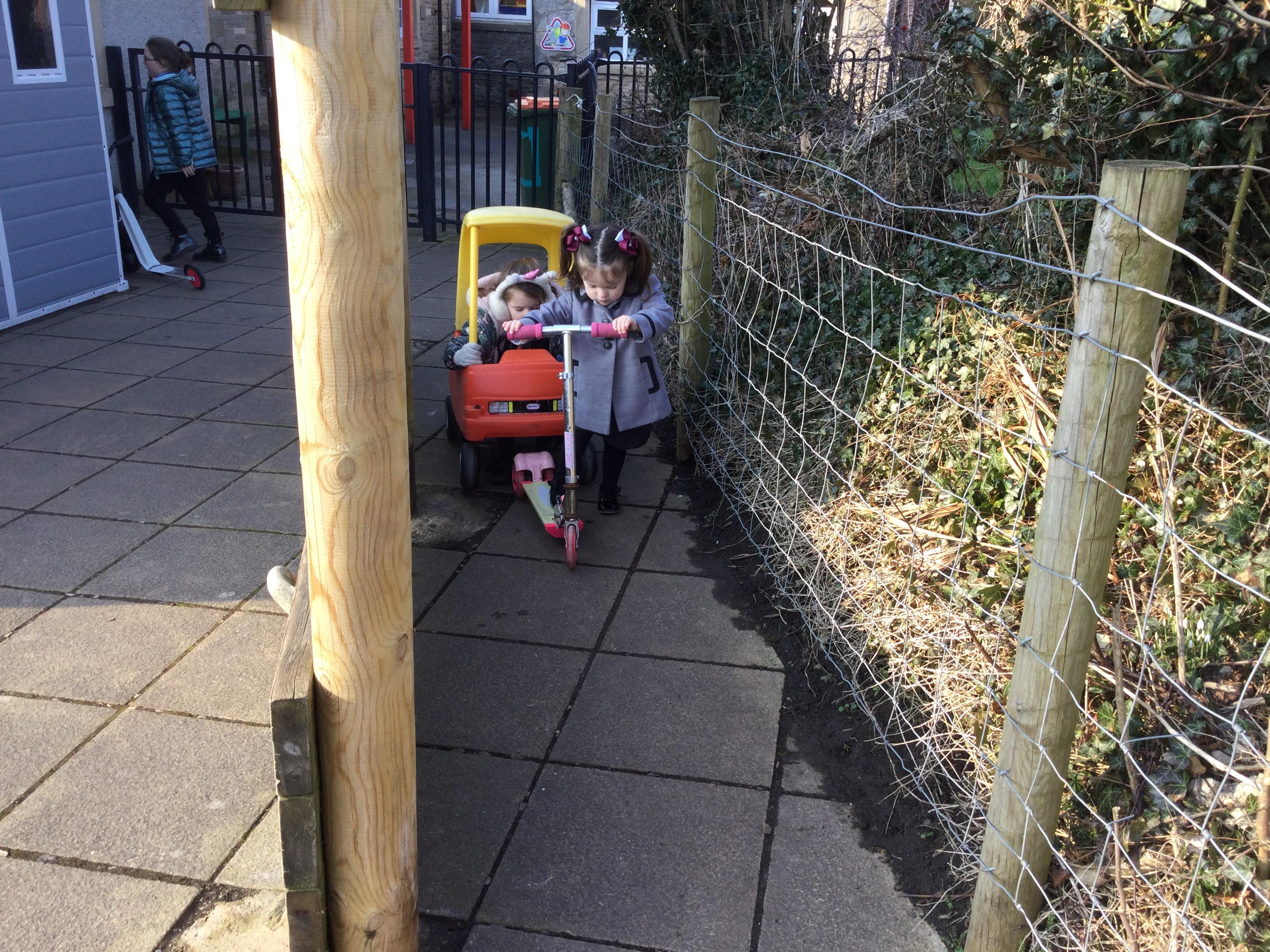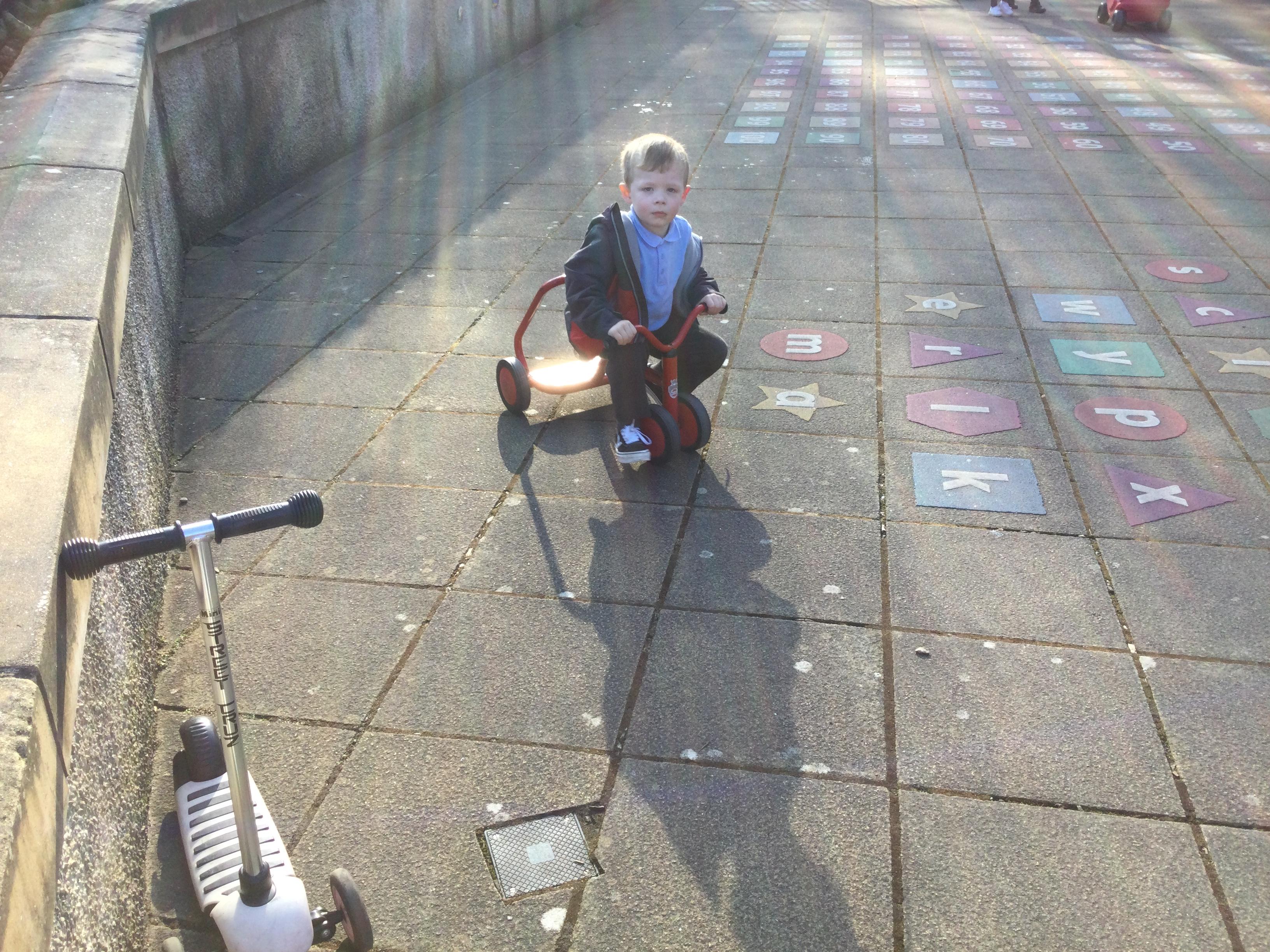 Enjoying bikes and scooters with our nursery playmates. The children are developing their gross motor skills as they pedal and scoot and in doing so show awareness of both their space and that of their peers.