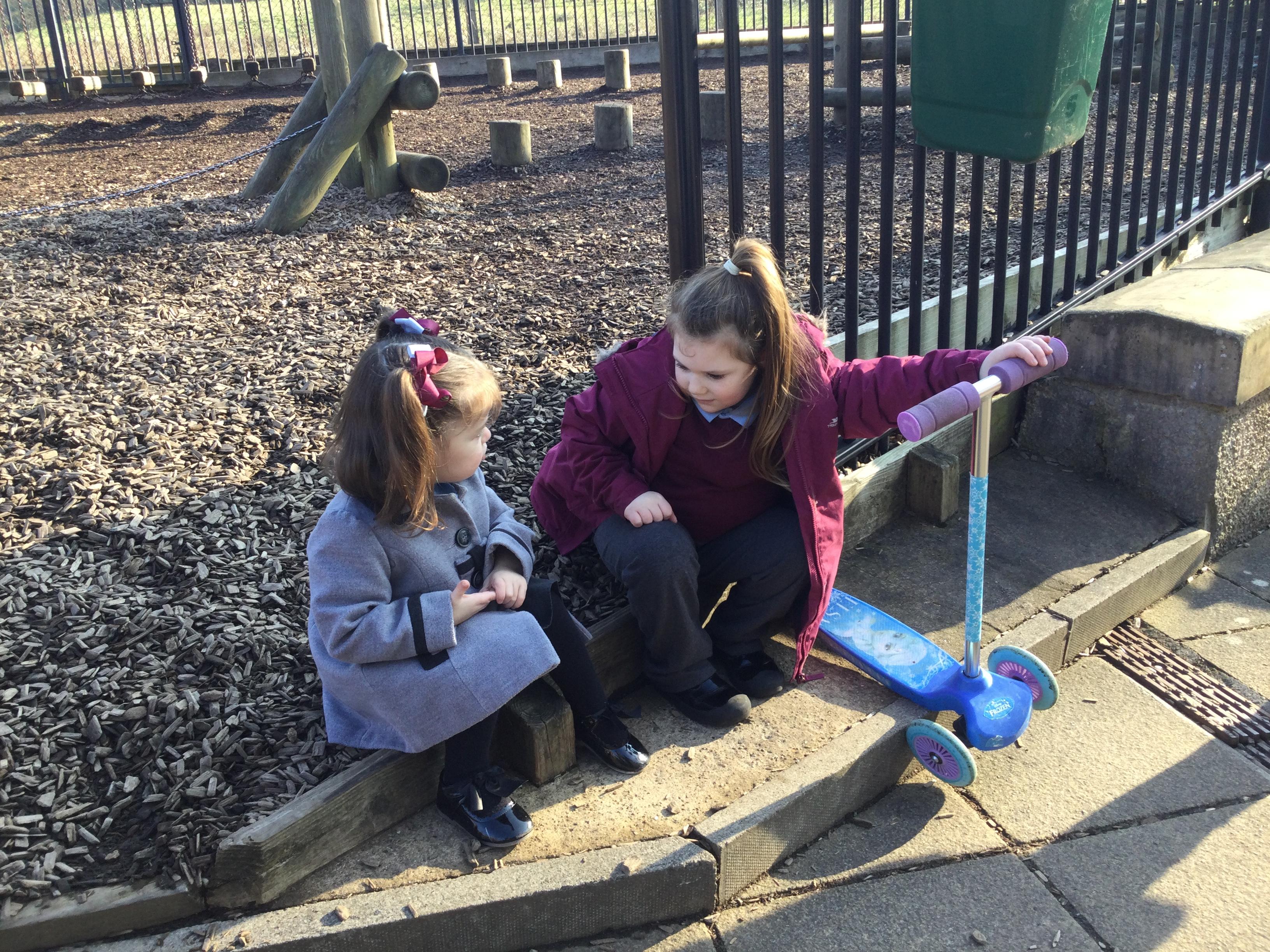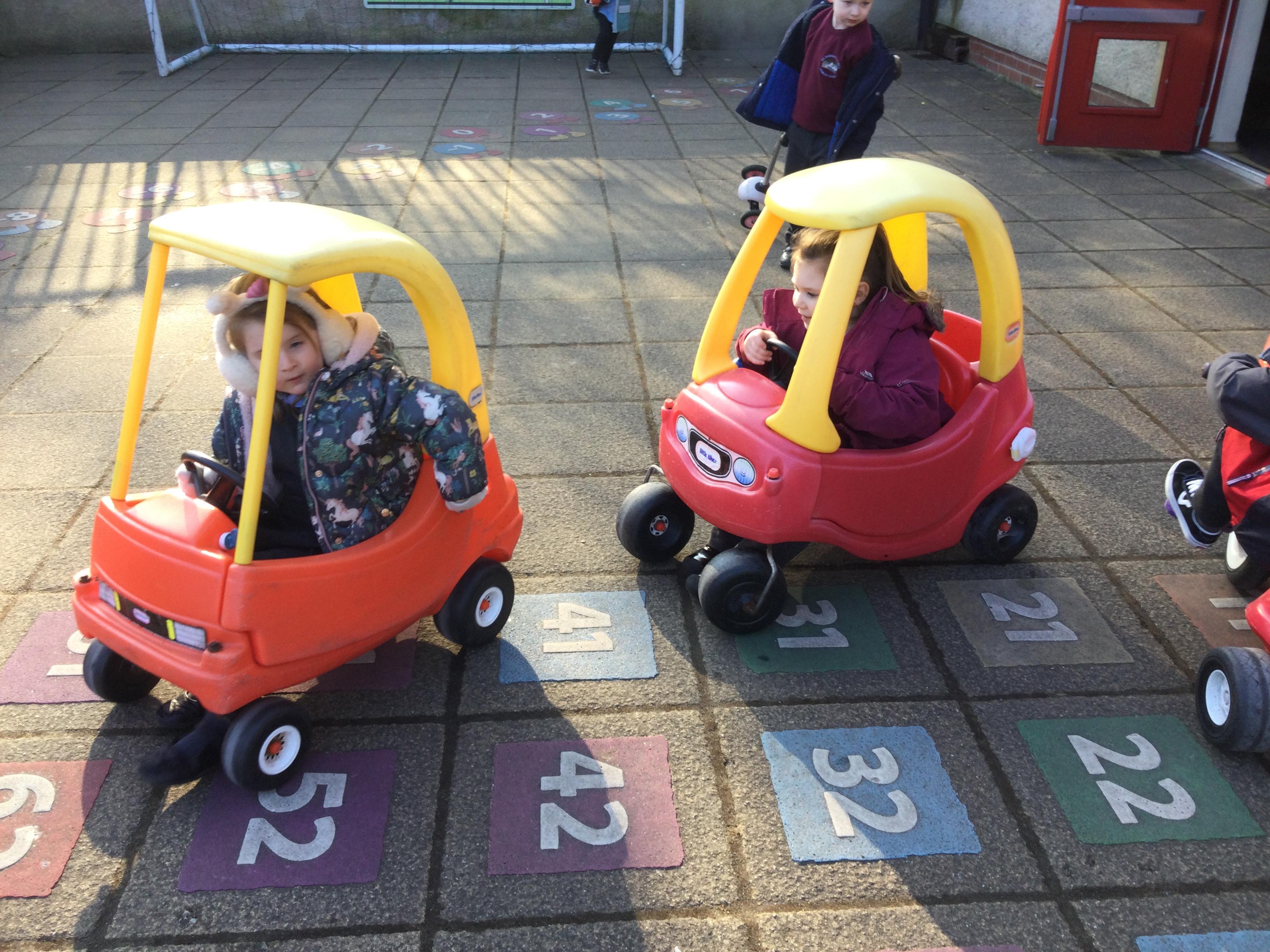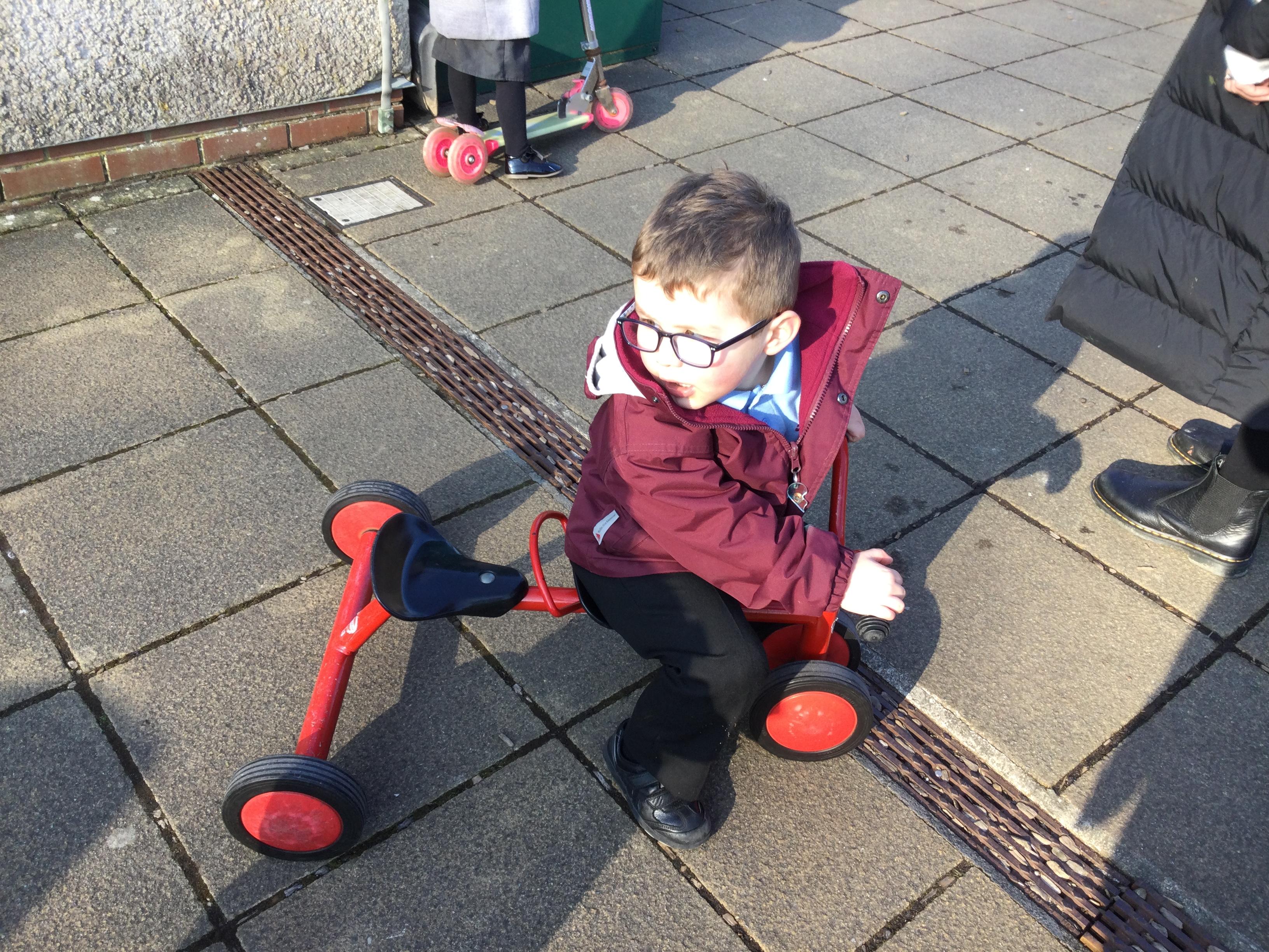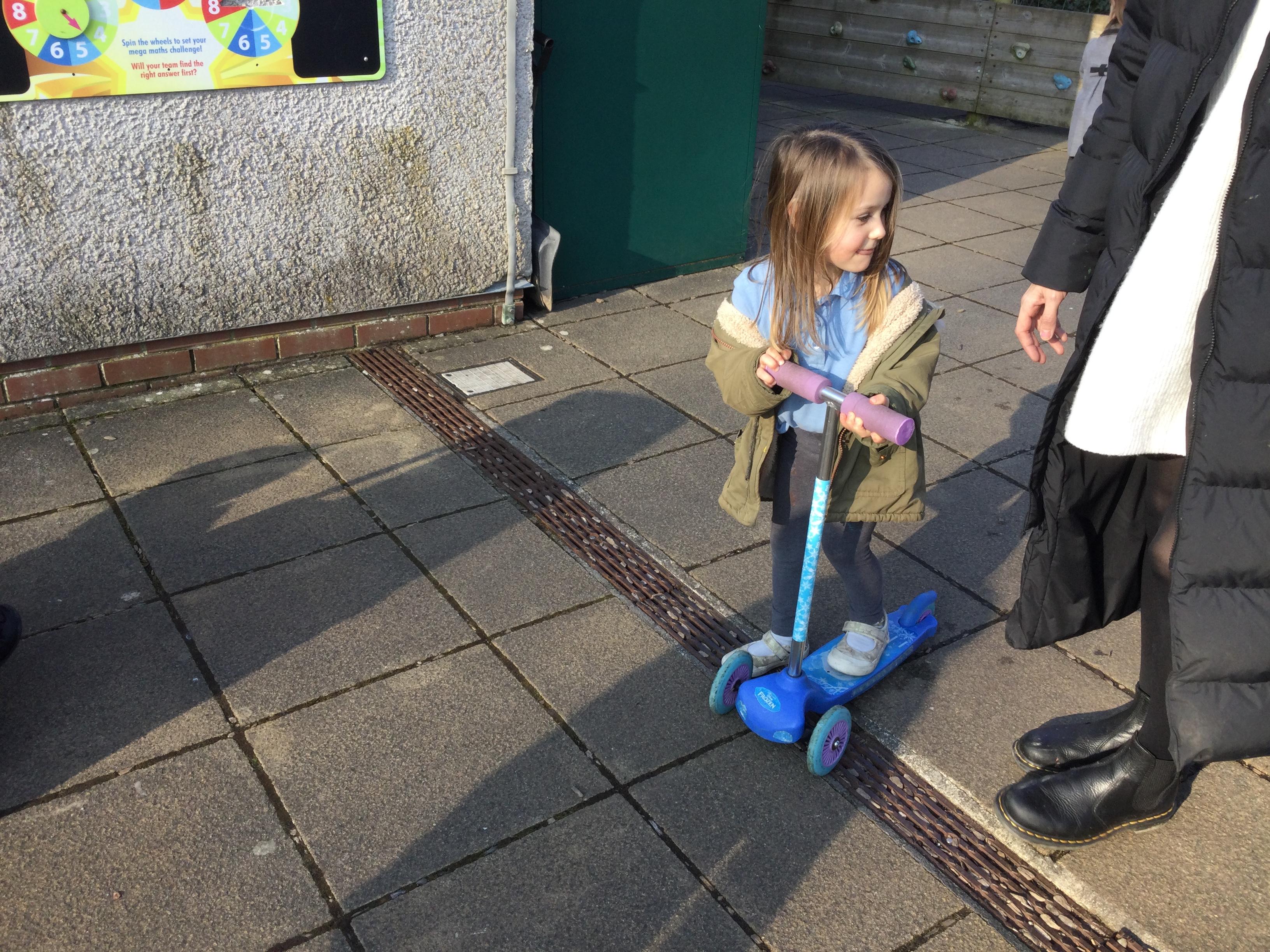 Enjoying bikes and scooters with our nursery playmates. The children are developing their gross motor skills as they pedal and scoot and in doing so show awareness of both their space and that of their peers.