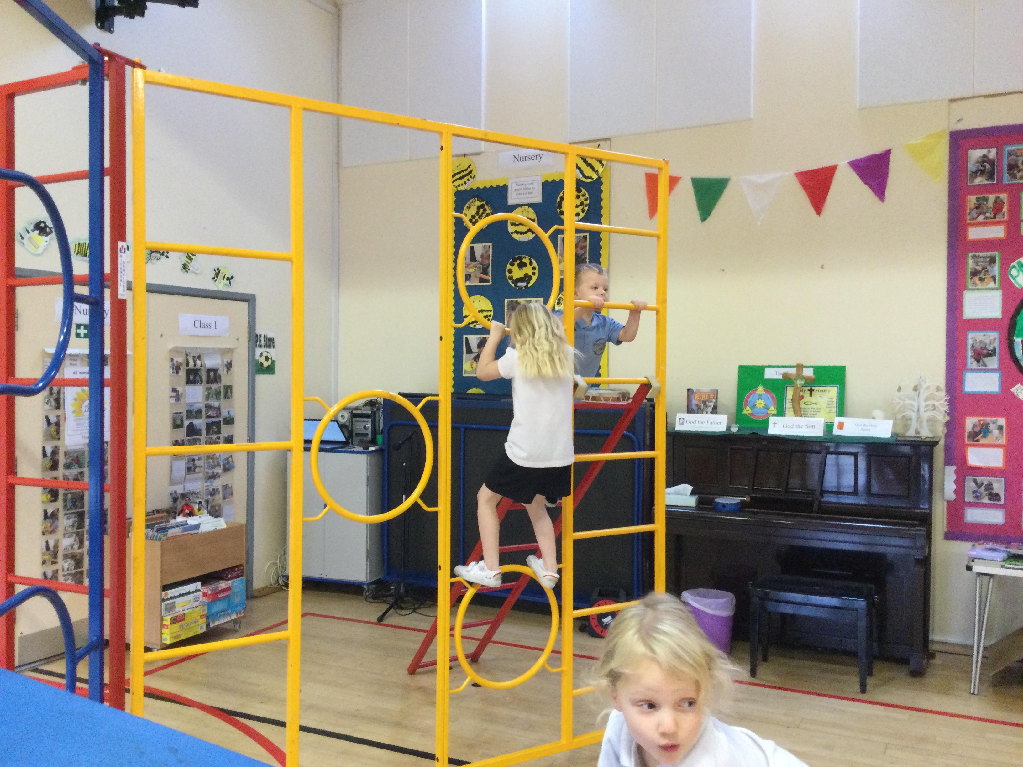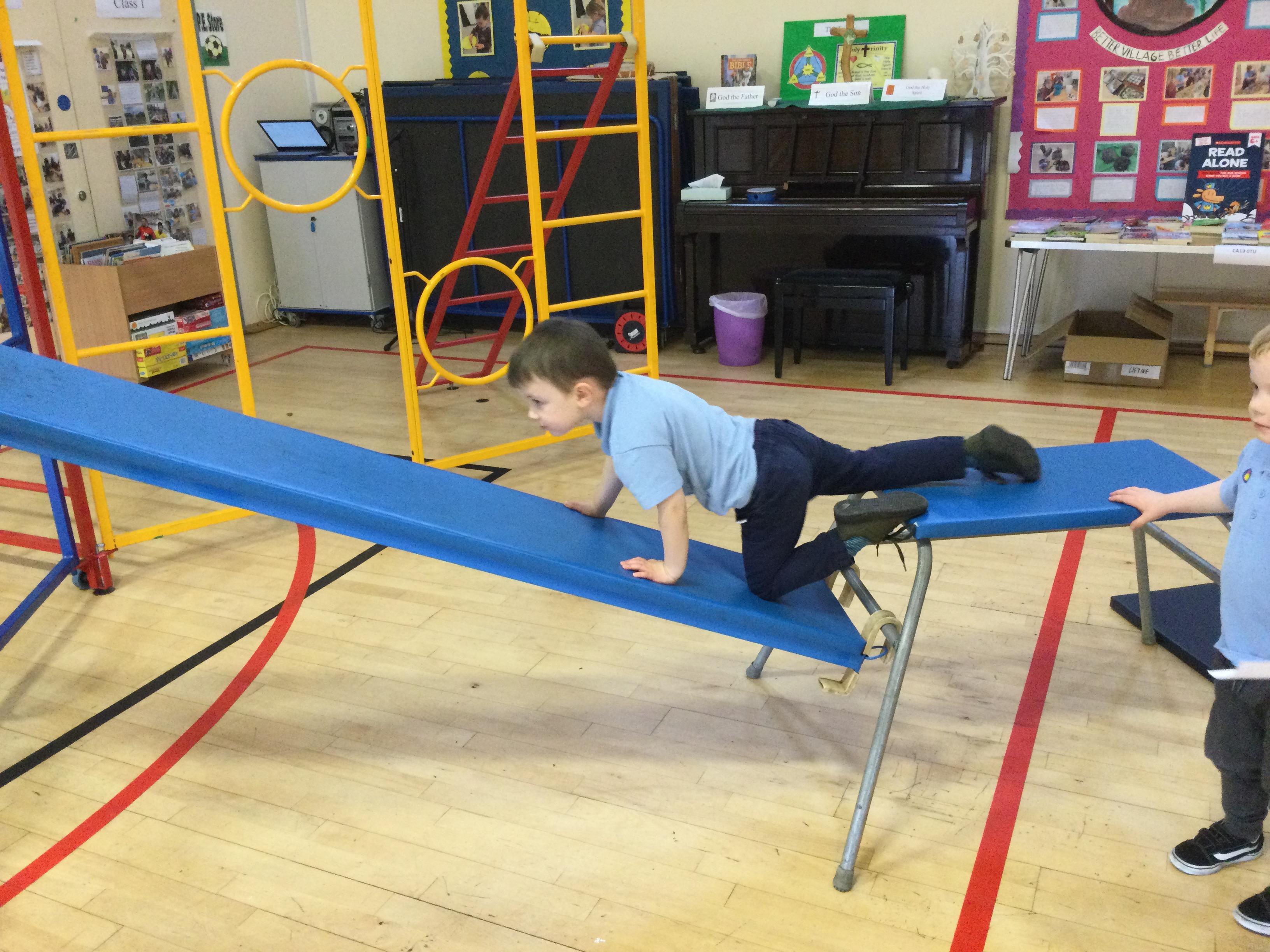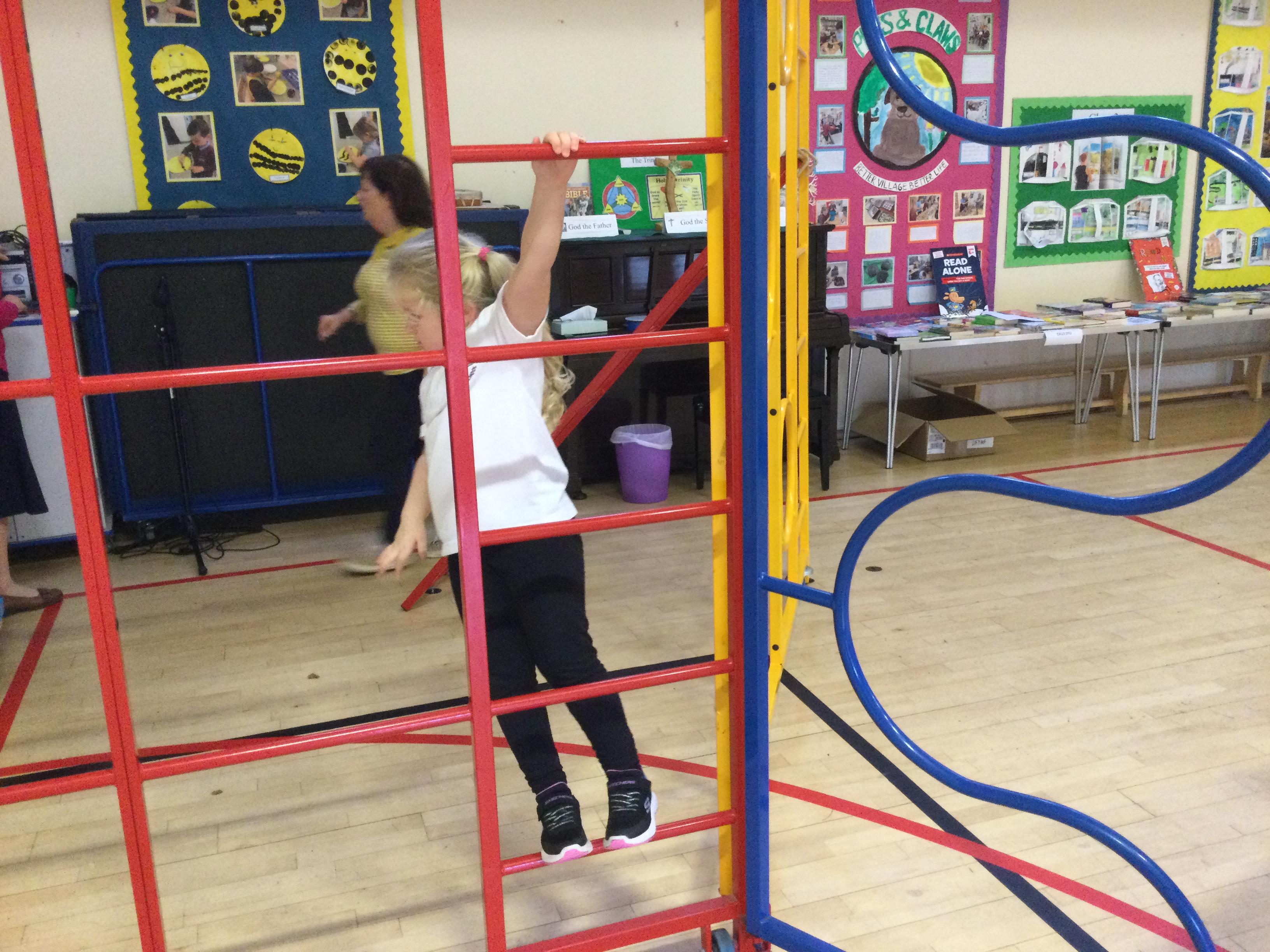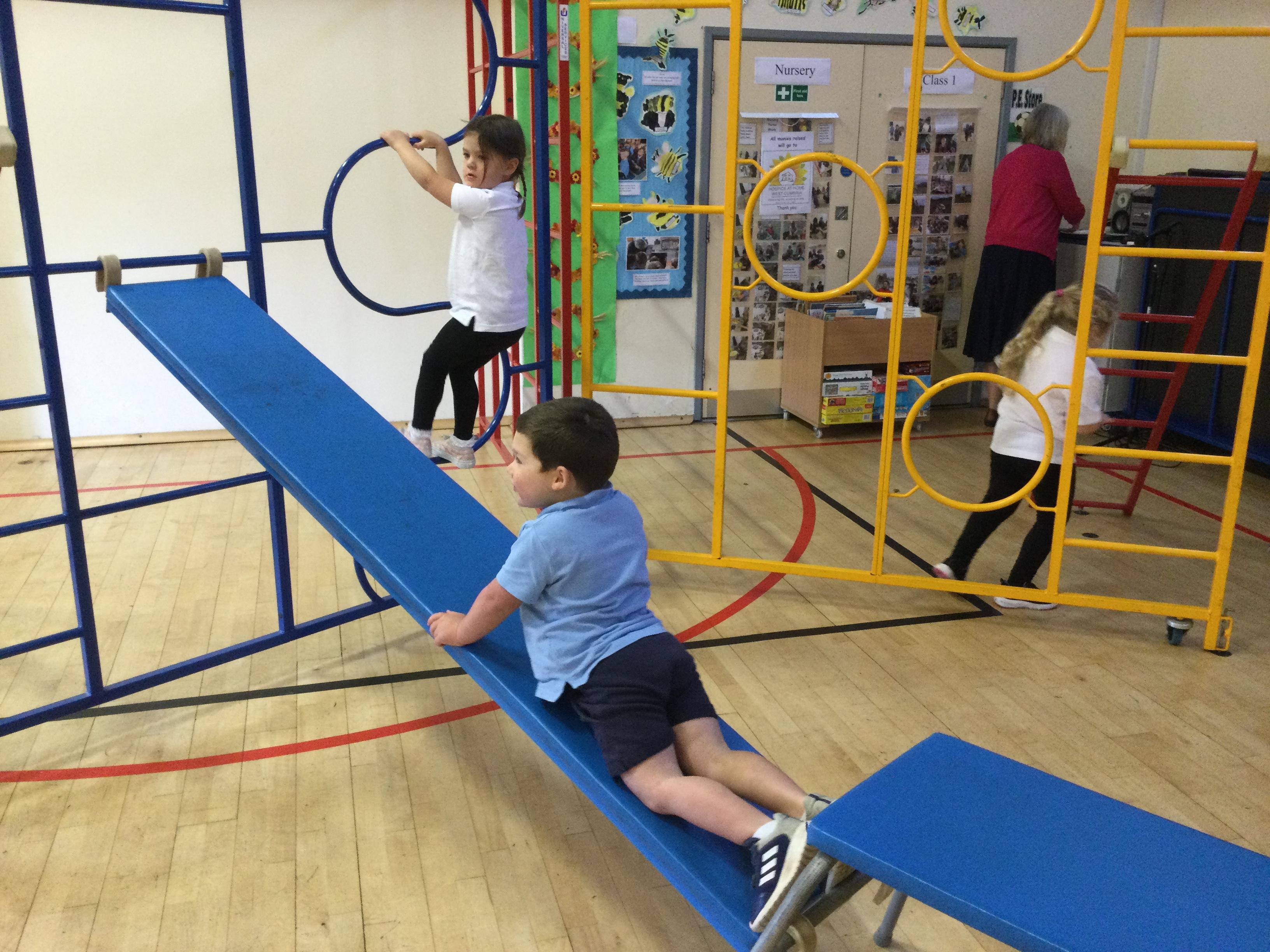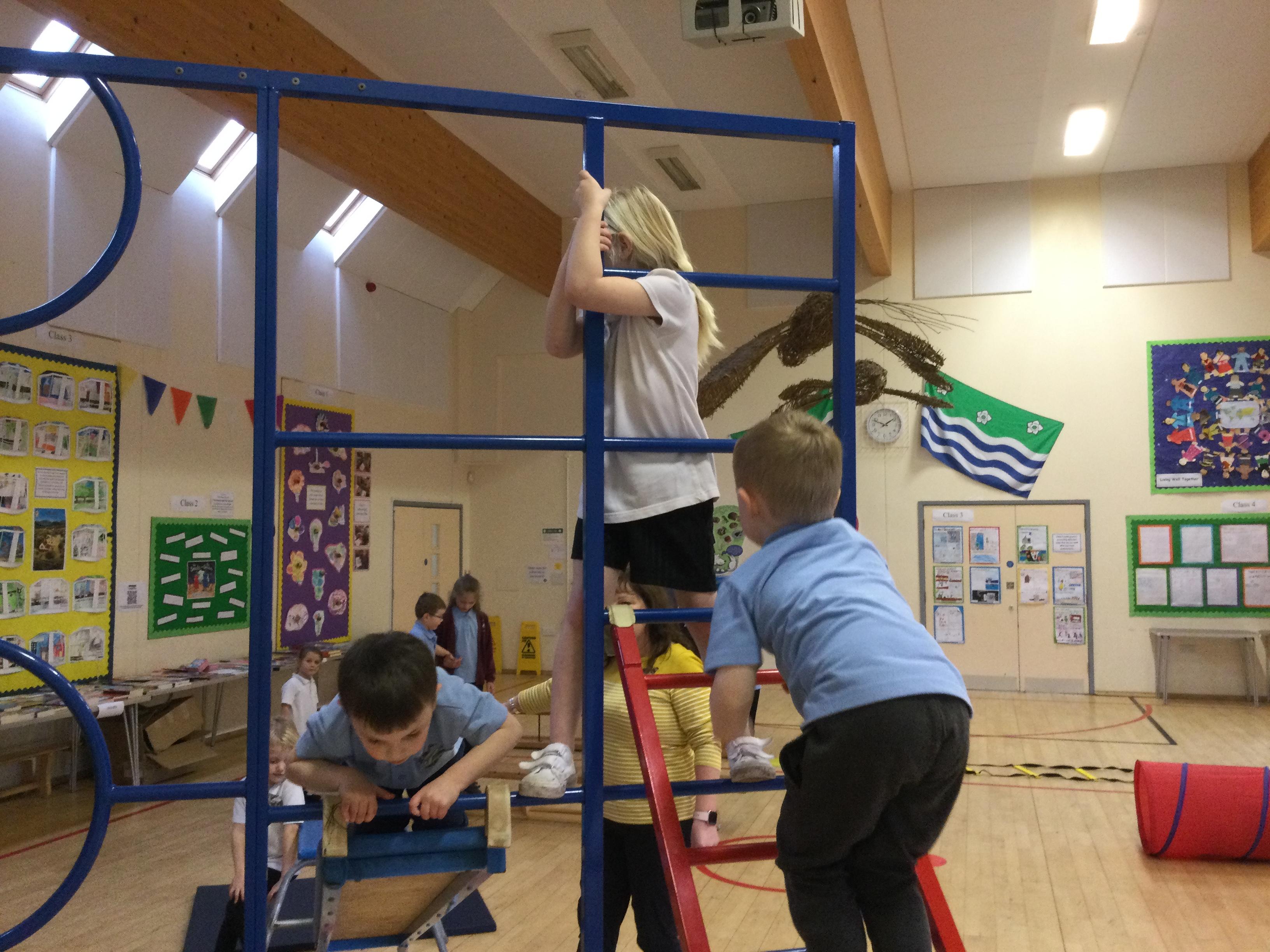 Accessing large apparatus in the school hall. The children were developing their ability to travel across a range of equipment and balance while holding a shape.