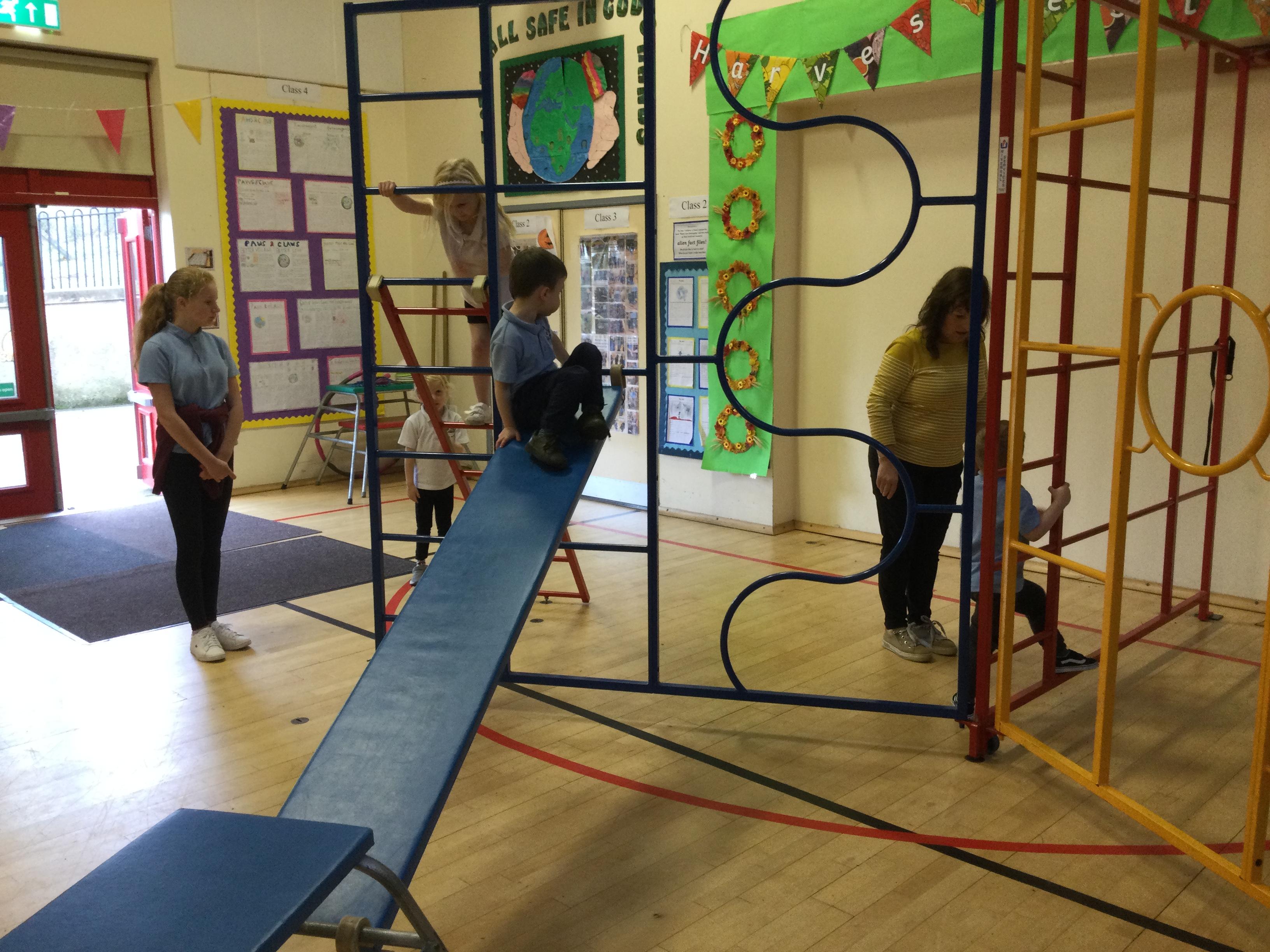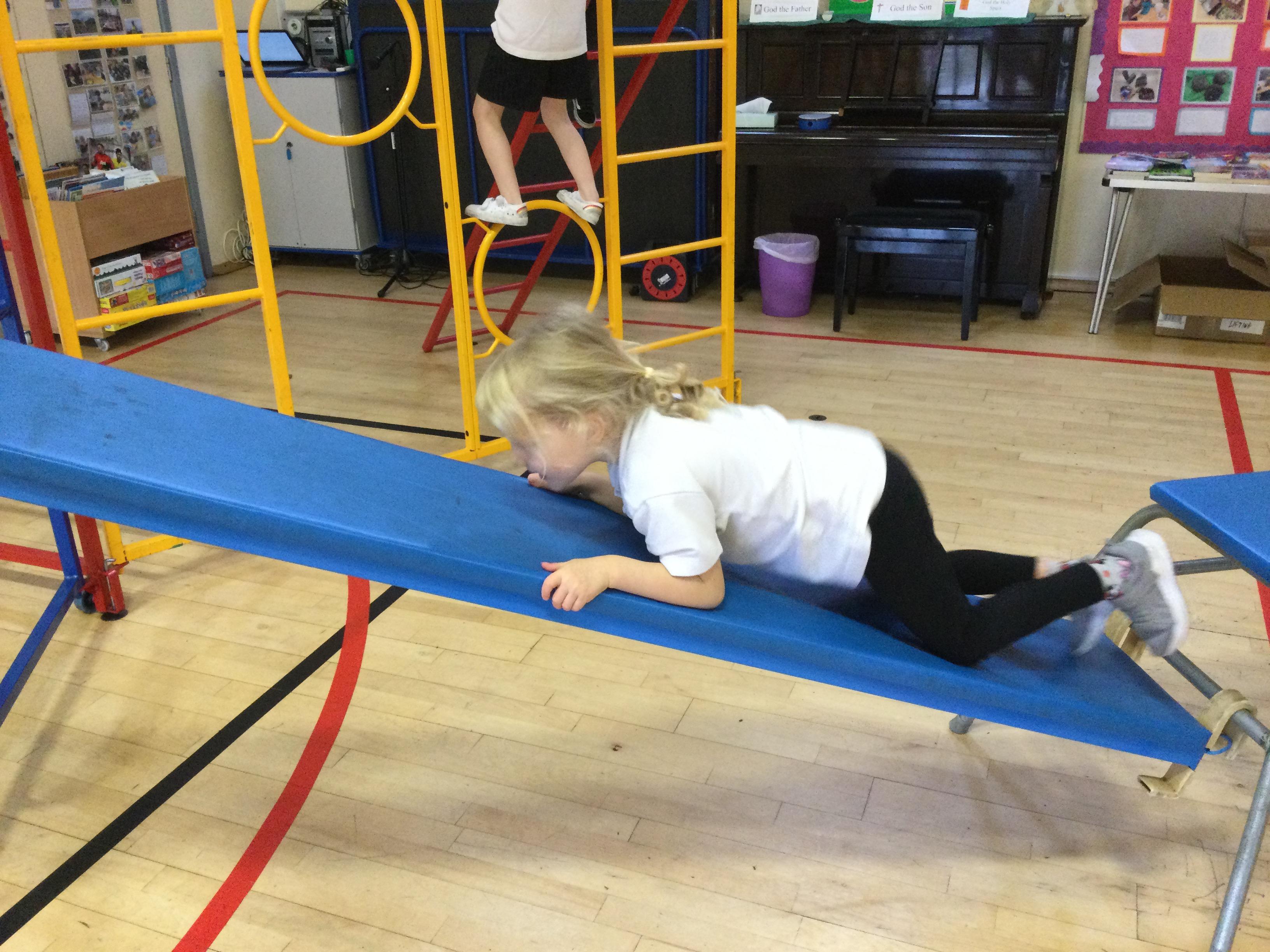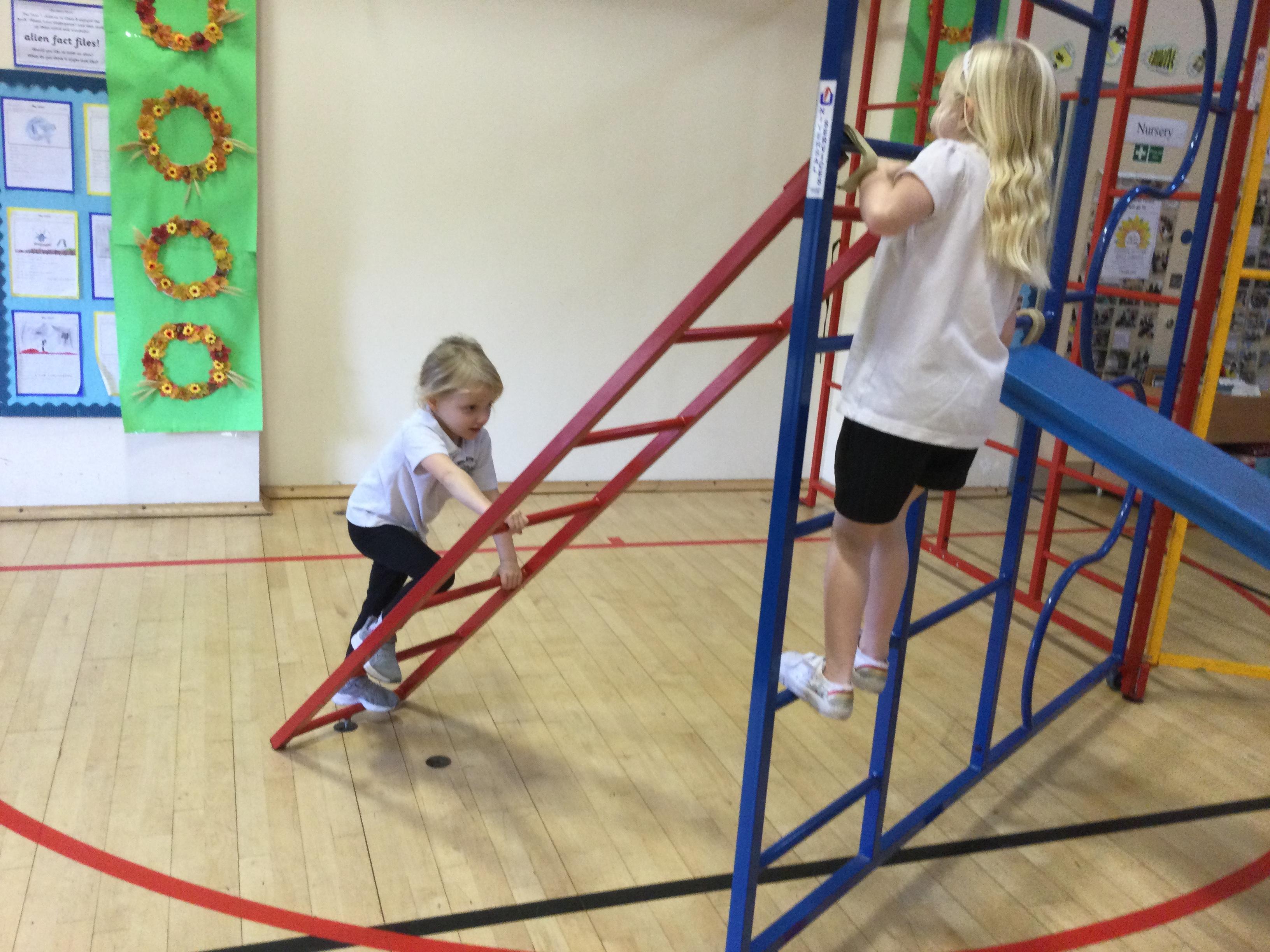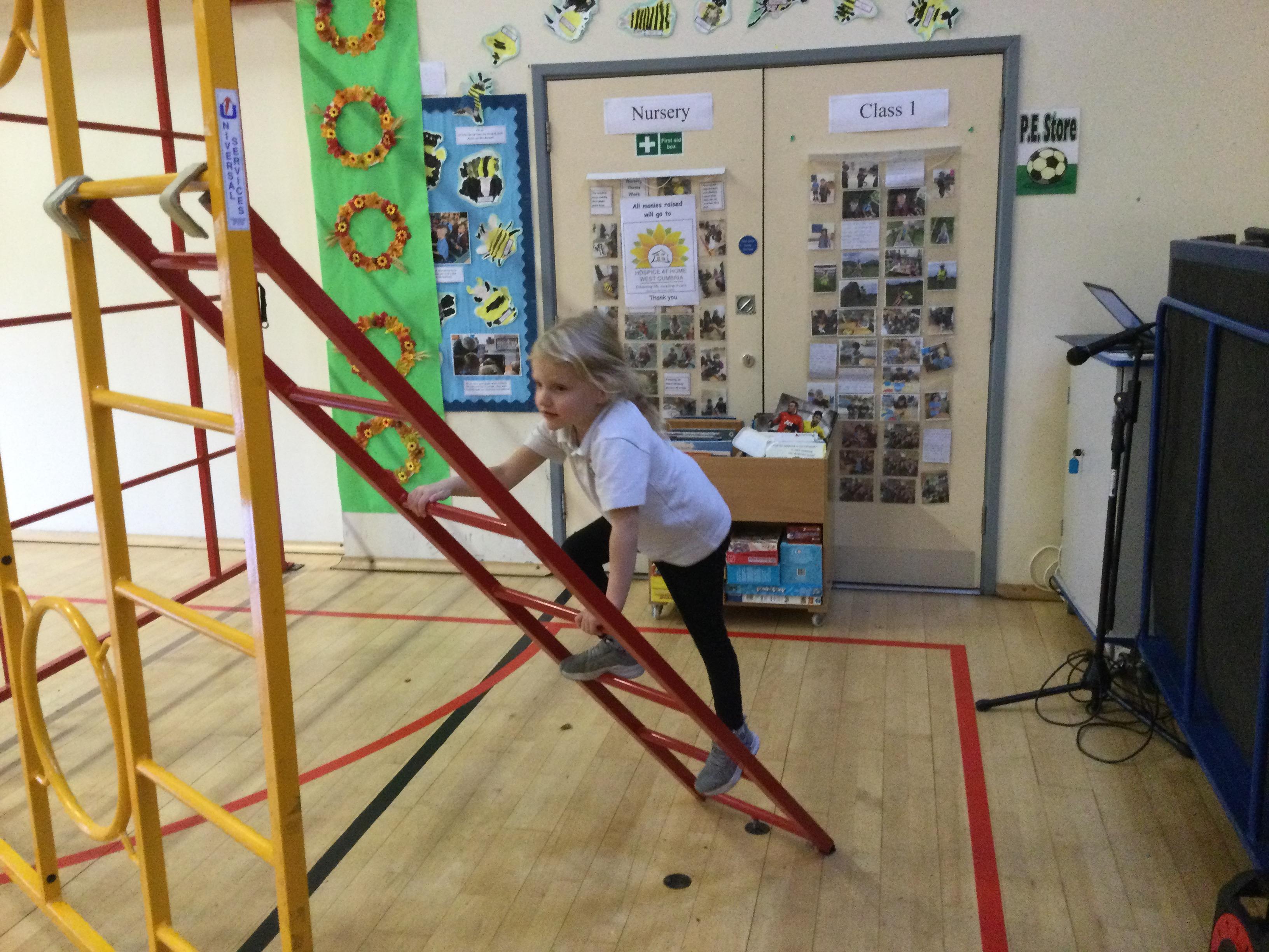 Accessing large apparatus in the school hall. The children were developing their ability to travel across a range of equipment and balance while holding a shape.