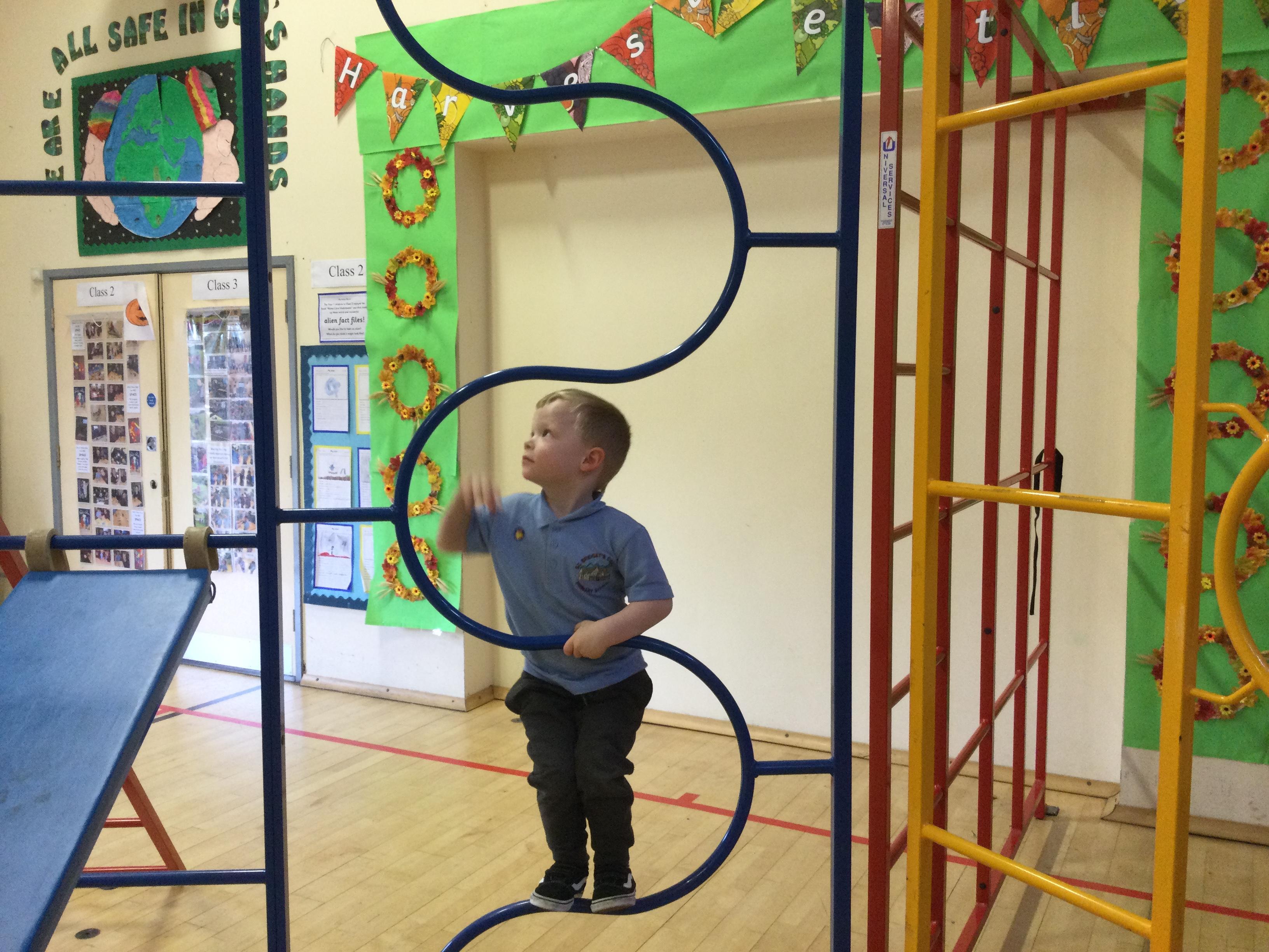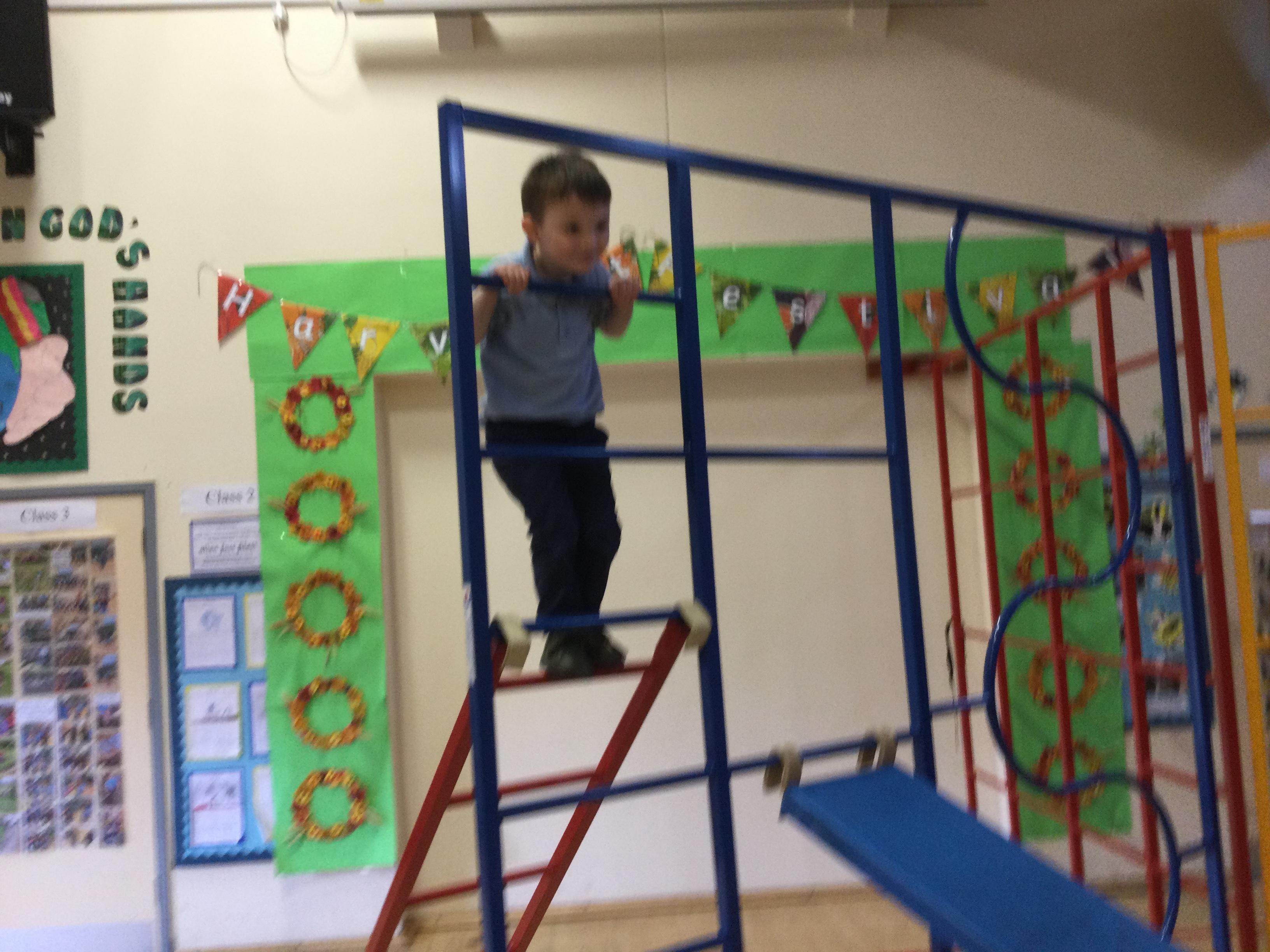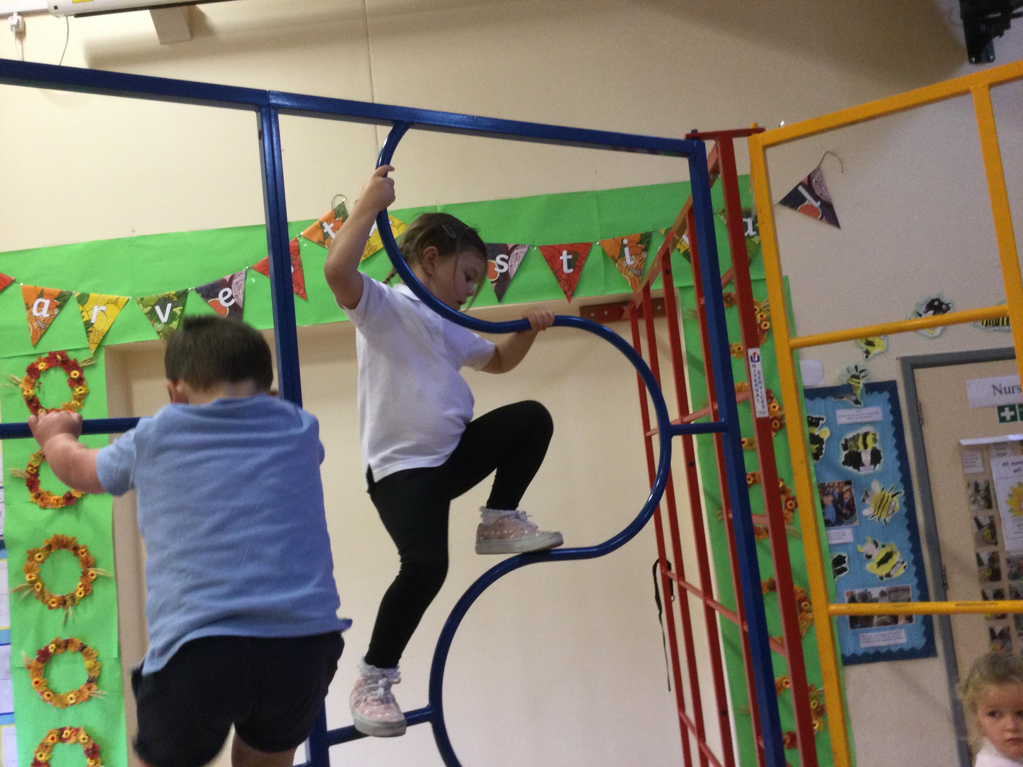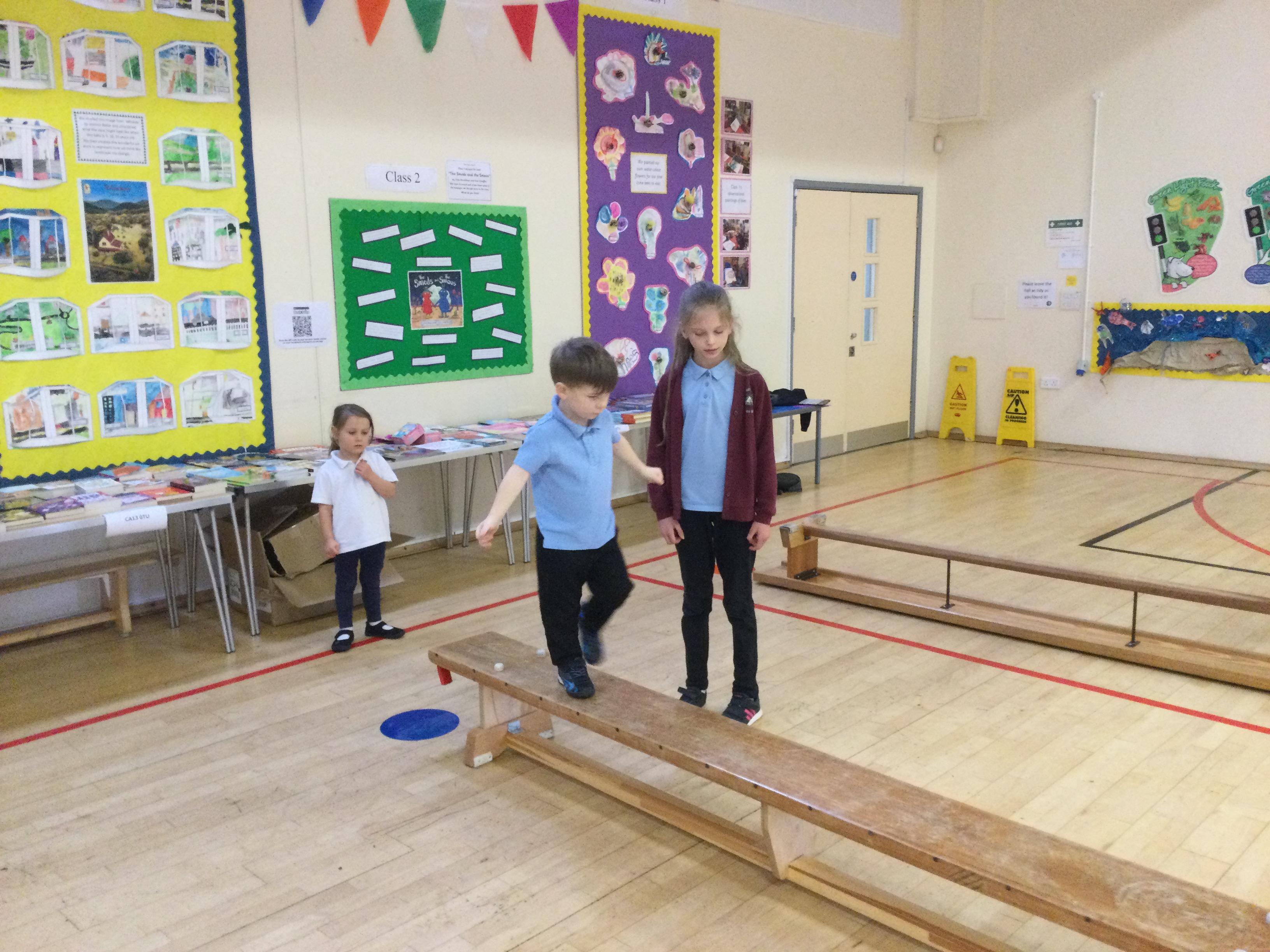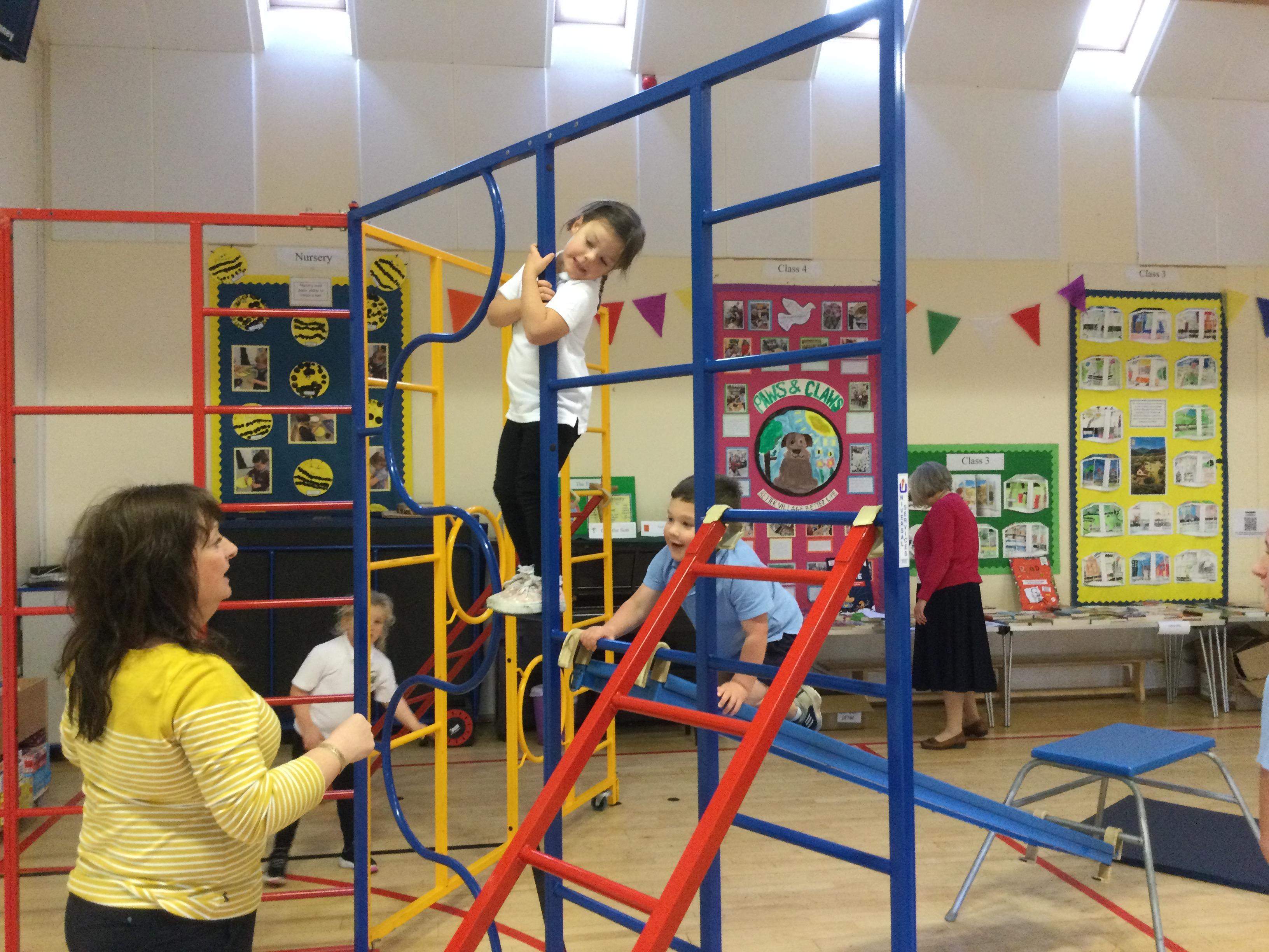 Accessing large apparatus in the school hall. The children were developing their ability to travel across a range of equipment and balance while holding a shape.