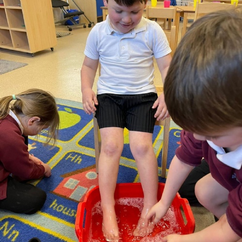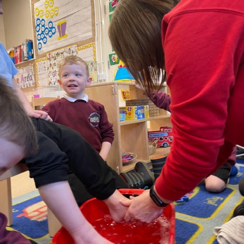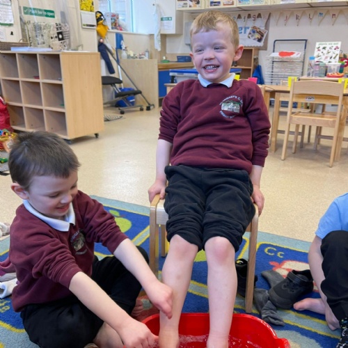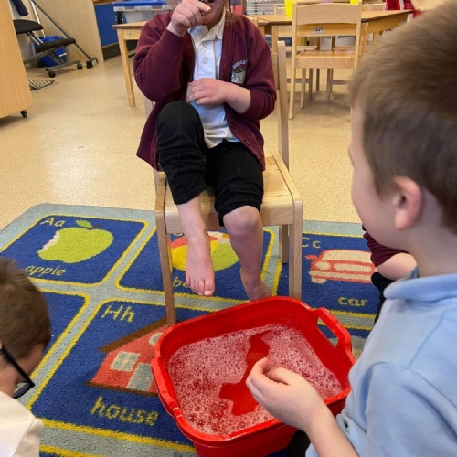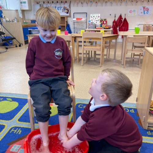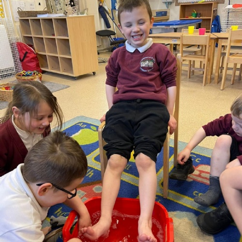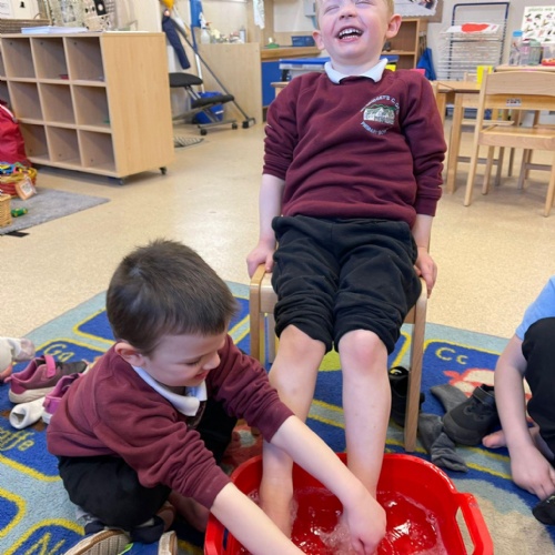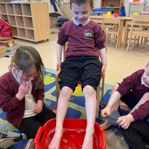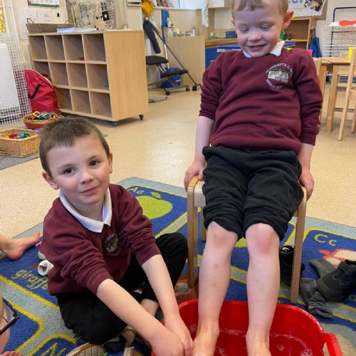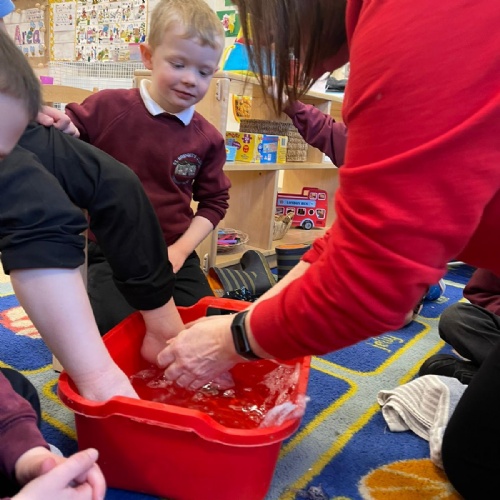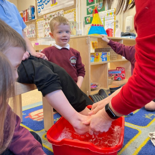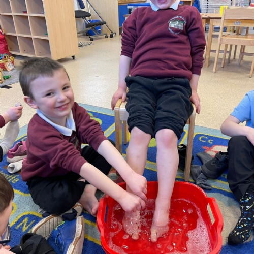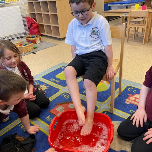 Washing our friends feet and enjoying a version of The Last Supper.In class 1 we have been looking at the Easter story . After the initial sharing of The Easter story Clever Cub visited us to tell us about the story in more detail. We then had great fun using props and LEGO people as Jesus and his disciples to re-enact the events. Then we watched a video clip of the last supper . We learnt about how in the bible times people often had dirty feet from walking on dusty roads in their sandals. People would wash their feet before going into people’s houses . Jesus washed his disciples feet as an example of kindness and love and asked them to follow in his footsteps . We then had a giggle as Mrs Hemingway washed Grayson’s feet and the children took it in turns to wash each other’s feet. We then sat at our tables in a line and pretended to be Jesus and his disciples eating the bread and wine ( juice) to remember Jesus’ body. The children chose Grayson as Jesus as he was sitting in the middle .