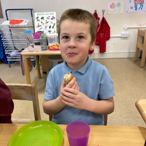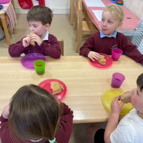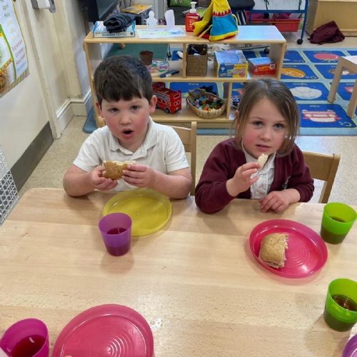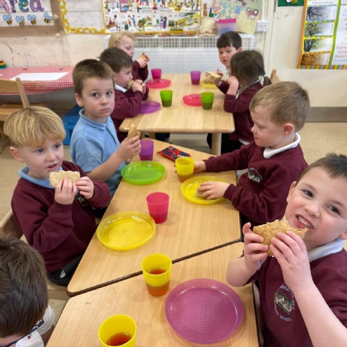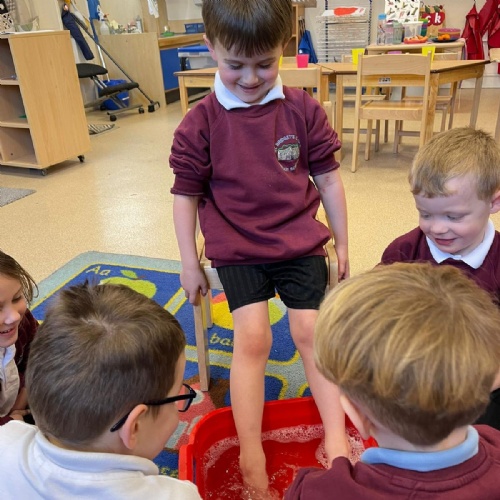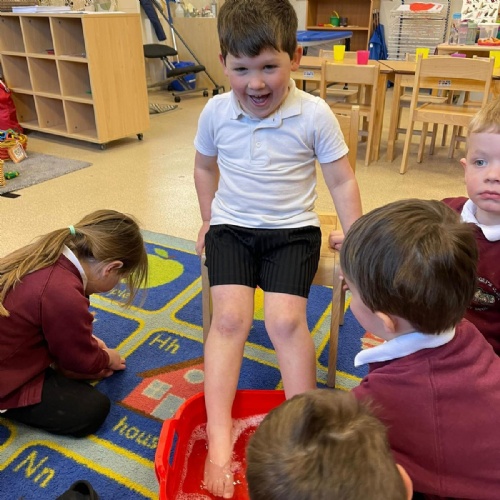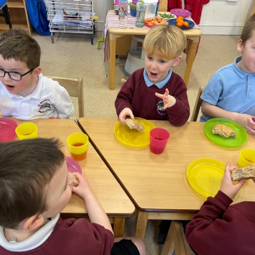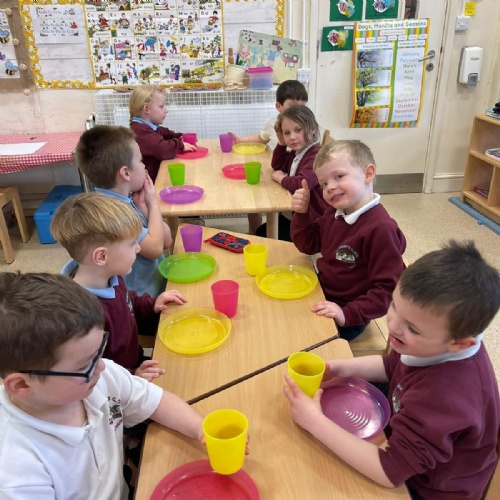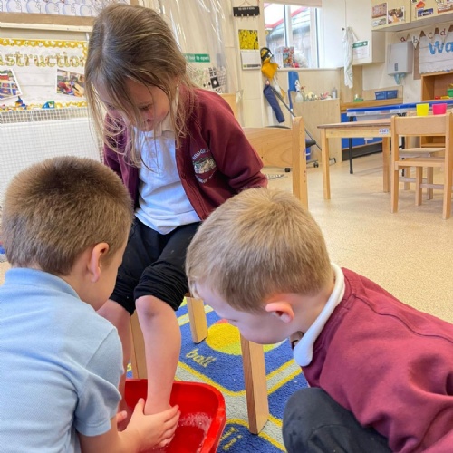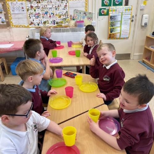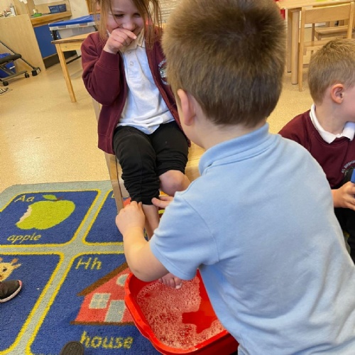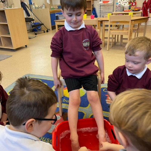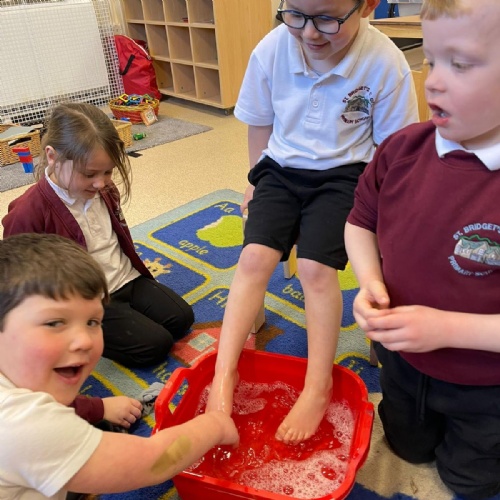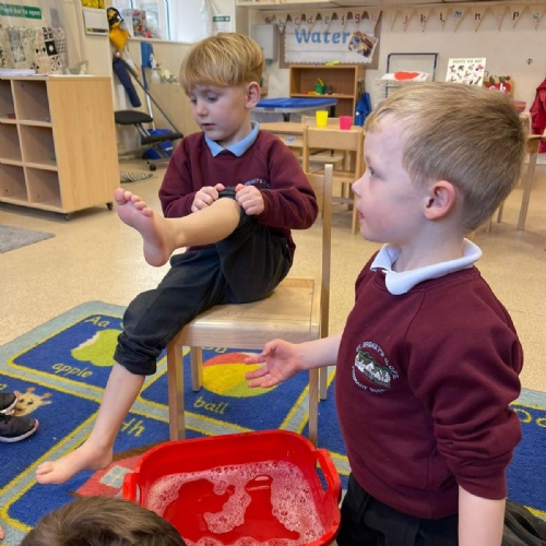 Washing our friends feet and enjoying a version of The Last Supper.In class 1 we have been looking at the Easter story . After the initial sharing of The Easter story Clever Cub visited us to tell us about the story in more detail. We then had great fun using props and LEGO people as Jesus and his disciples to re-enact the events. Then we watched a video clip of the last supper . We learnt about how in the bible times people often had dirty feet from walking on dusty roads in their sandals. People would wash their feet before going into people’s houses . Jesus washed his disciples feet as an example of kindness and love and asked them to follow in his footsteps . We then had a giggle as Mrs Hemingway washed Grayson’s feet and the children took it in turns to wash each other’s feet. We then sat at our tables in a line and pretended to be Jesus and his disciples eating the bread and wine ( juice) to remember Jesus’ body. The children chose Grayson as Jesus as he was sitting in the middle .