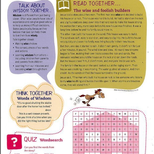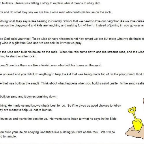 One of the bible stories we will use for this value is The wise and foolish builders (Matthew 7: 24-27), you can share this with your child by reading the version below or the one on the Take home sheet.